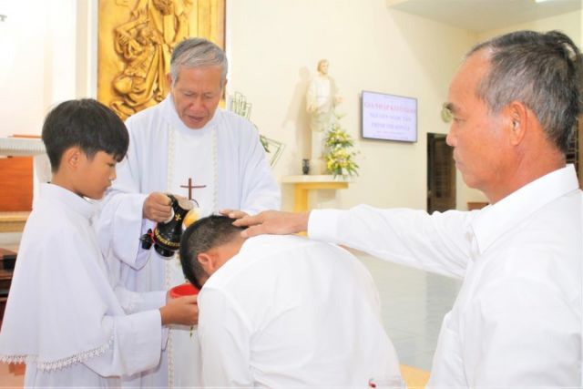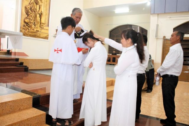 Sau bài giảng, cha chủ tế cử hành nghi thức Rửa Tội và Thêm Sức cho hai anh chị Dự tòng ngay trên cung thánh.