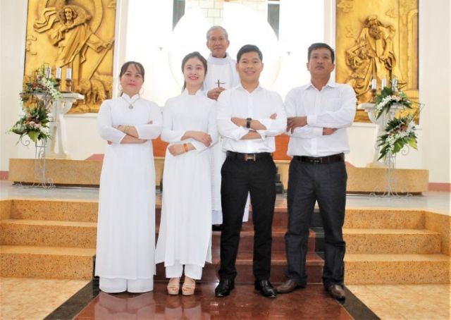 Kết thúc thánh lễ, cha Giuse đã ghi hình lưu niệm với anh chị tân tòng, bố mẹ đỡ đầu và ân thân nhân của gia đình 2 anh chị.