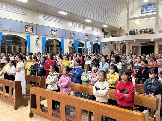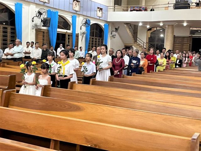 Lúc 4 giờ 45 thứ bảy ngày 02 tháng 09 năm 2023, trong cơn mưa nặng hạt vì ảnh hưởng cơn bão số 3, nhưng đông đảo giáo dân cùng với bà con, con cái cháu chắt của ông bà Phểrô Nguyễn Vương và Maria Trần Thị Cử hân hoan về nhà thờ hiệp dâng thánh lễ ta ơn 50 năm hôn phối, 02.09.1973-02.09.2023.