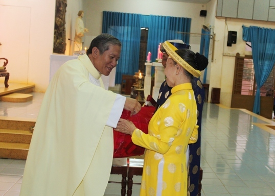 Trước khi ghi hình lưu niệm, cha quản xứ đã tặng quà cho ông bà.