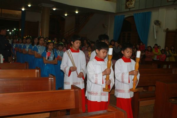 Cha quản xứ Giuse Trần Thế Thành chủ sự thánh lễ, bắt đầu bằng đoàn rước trọng thể từ cuối nhà thờ gồm các em đội múa, các gia đình trẻ với đầy đủ bố mẹ và con cái, quý ông ban hành giáo các giáo họ, Thường Vụ Hội Đồng Giáo Xứ và cuối cùng cha chủ tế.