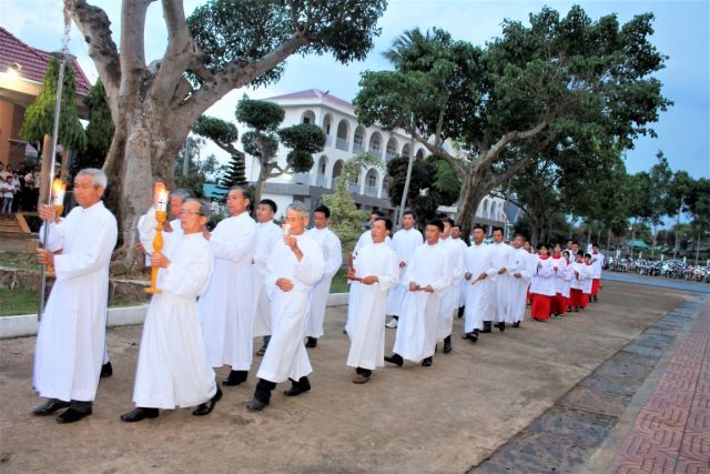 Thánh lễ kết thúc lúc 17g30. Cha Giuse chủ sự kiệu Thánh Thể một vòng quanh nhà thờ về đến nhà tạm.