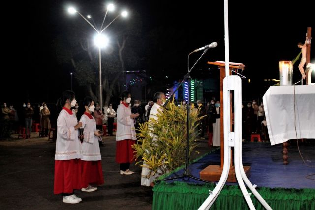 Sống trong tình trạng tình hình mới với đại dịch Covid, cha quản xứ Giáo xứ Thổ Hoàng đã tổ chức thánh lễ đêm Vọng Giáng Sinh 2021 trong khuôn viên nhà thờ vào lúc 19 giờ ngày 24.12,2921, mục đích thông thoáng cho bà con giáo dân tích cực phòng dịch với 5 K.