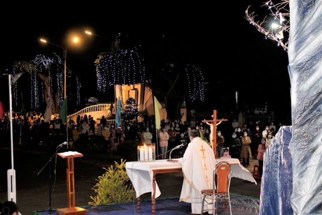 Sau giờ kinh ngắn gọn giúp cộng đoàn mở lòng mình ra tha thiết mong chờ Đấng Cứu Thế, thánh lễ được bắt đầu vào lúc 19 giờ 15 bằng chiếc xe hoa kiệụ chúa Hài Đồng từ Hội trường Giáo xứ tiến vể hang đá, nơi đây cha Giuse dâng thánh lễ trọng thể Vọng Giáng Sinh.