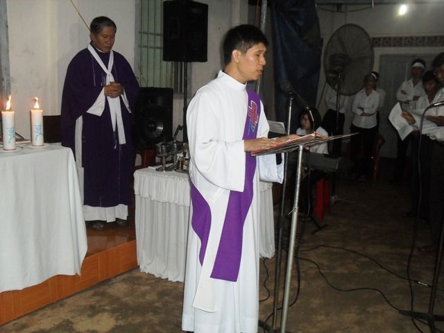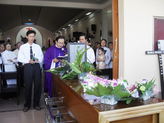 8 giờ 15 cha Quản xứ Đa Minh làm nghi thức đầu lễ và cho rước linh cửu bà cố Maria vào nhà thờ.