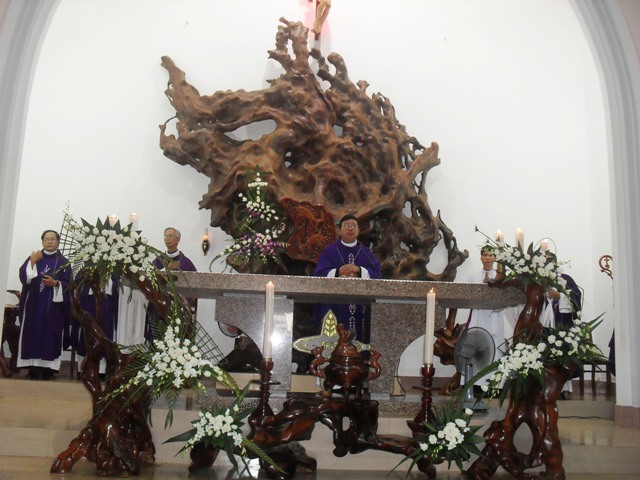 Vì trời mưa to, đoạn đường nơi cầu Duy Hòa bị ngập xe bị kẹt hơn 30 phút nên chúng tôi đã không thể đến đúng giờ quy định là 17 giờ 30 để dâng kinh nên tham dự Thánh Lễ trước rồi dâng kinh sau.