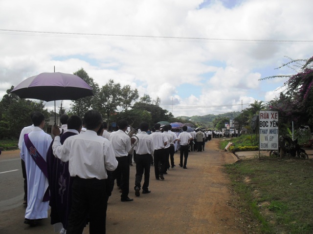 Đúng 8 giờ di quan Linh cửu bà cố Maria từ tư gia tới nhà thờ, con đường từ nhà bà cố tới nhà thờ khoảng 150 mét, mấy ngày trước cha Quản xứ Kim Châu Đa Minh Phạm Sỹ Hiện đã cùng với Giáo dân cắt tỉa cây xanh 2 bên đường thẳng tắp, bằng phẳng thật đẹp, đoàn rước khá dài, trong đó có rất đông là Giáo dân Thổ Hoàng, con chiên của cha Giu se với áo trắng, cuốn khăn tang màu tím trên cánh tay trái nghiêm trang đi trong đoàn rước.