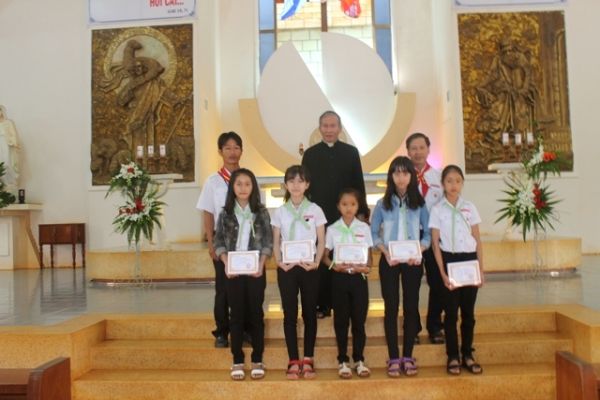 Đặc biết Cha quản xứ vui mừng, khích lệ và tặng thưởng cho 5 em đoạt giải xuất sắc nhất toàn đoàn gồm các em sau: