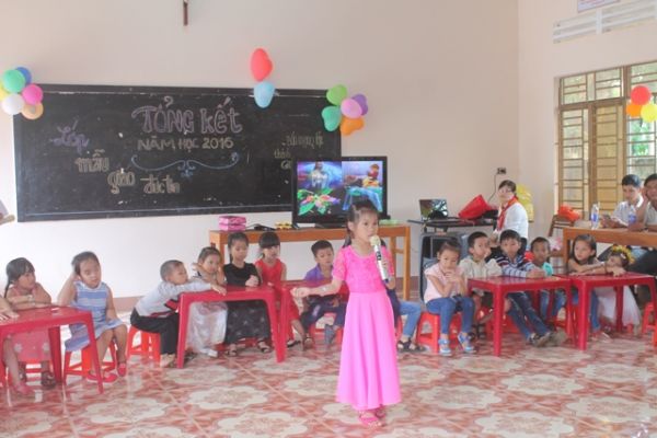 Trong giờ tổng kết, các cháu thể hiện mình bằng năng khiếu đọc thơ, múa, hát, kể chuyện và trắc nghiệm giáo lý.