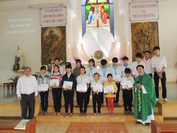 Vào lúc 7g30 chúa nhật 29 thường niên lễ khánh nhật truyền giáo, cha quê hương G.B Nguyễn Kim Hường đã chủ sự thánh lễ dành riêng cho thiếu nhi, trong thánh lễ hôm nay có chương trình phát học bổng cho 18 em học sinh hiếu học có hoàn cảnh khó khăn, chương trình phát học bổng đã được các anh chị sinh viên học sinh, những người con của quê hương làm ăn xa thực hiện với sự cộng tác tích cực của bà con trong giáo xứ đúng như ý nghĩa mà cha chủ tế G.B chia sẻ cùng mọi người trong thánh lễ: “Món quà hôm nay được trao tặng tới các em tuy rất nhỏ bé nhưng lại bao hàm cả một ý nghĩa rất lớn, lớn không phải bởi vì giá trị của vật chất nhiều hay ít, nhưng lớn bởi giá trị của tình yêu, bởi ý thức sẻ chia, ý thức biết làm việc để phục vụ cộng đồng, và sự sẻ chia hôm nay không phải chỉ riêng công sức của Hội Đồng Hương, nhưng còn có sự cộng tác tích cức của toàn giáo xứ trong những ngày vui xuân”.