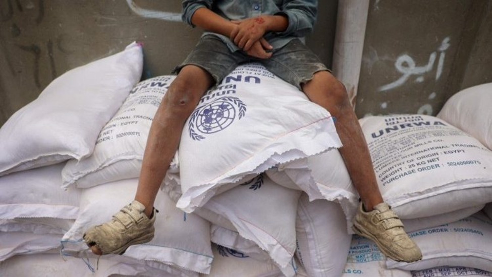 Một em nhỏ Palestine ngồi trên những bao bột mì do UNRWA cung cấp (AFP hoặc các bên cấp phép)