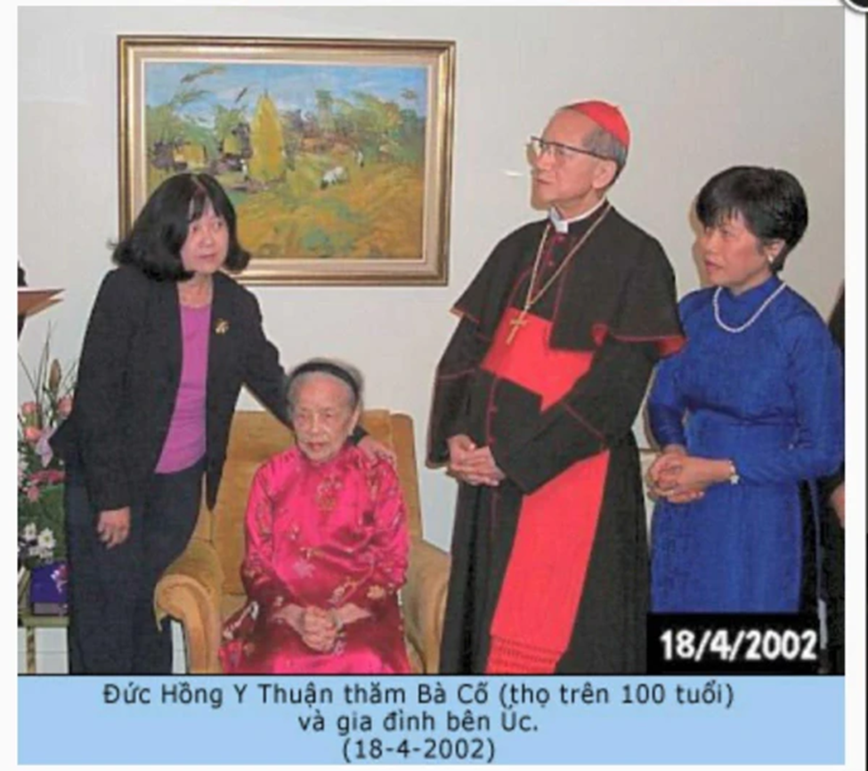 Đấng Đáng Kính Văn Thuận thăm gia đình tại Sydney, Úc, nhân dịp mừng sinh nhật lần thứ 100 của thân mẫu (ngồi) vào tháng 4 năm 2002, chỉ vài tháng trước khi ngài qua đời tại Rôma vì bệnh ung thư dạ dày ngày 16.09.2002. Ảnh: do bà Elisabeth Nguyễn cung cấp.