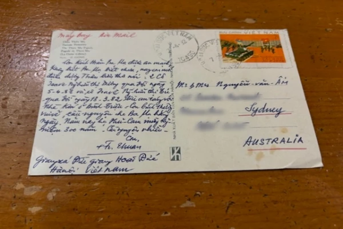 Một tấm bưu thiếp Đấng Đáng Kính Văn Thuận gửi cho cha mẹ vào năm 1982. Ảnh: do bà Elisabeth Nguyễn cung cấp.